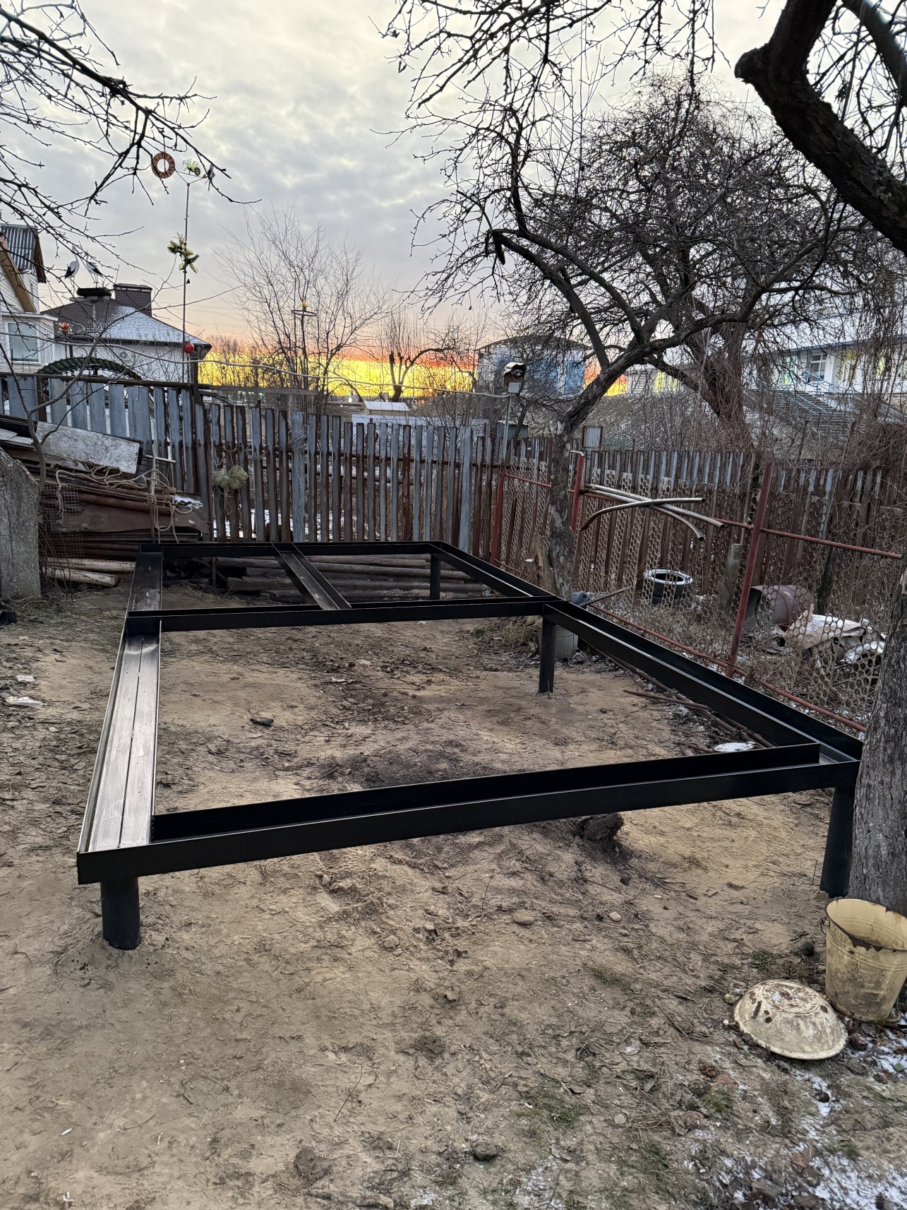 Монтаж 20 винтовых свай диаметром 108 мм длиной 2,5-3 метра. Усиление конструкции с помощью металлического уголка (50x50 мм) и швеллера для распределения нагрузки.