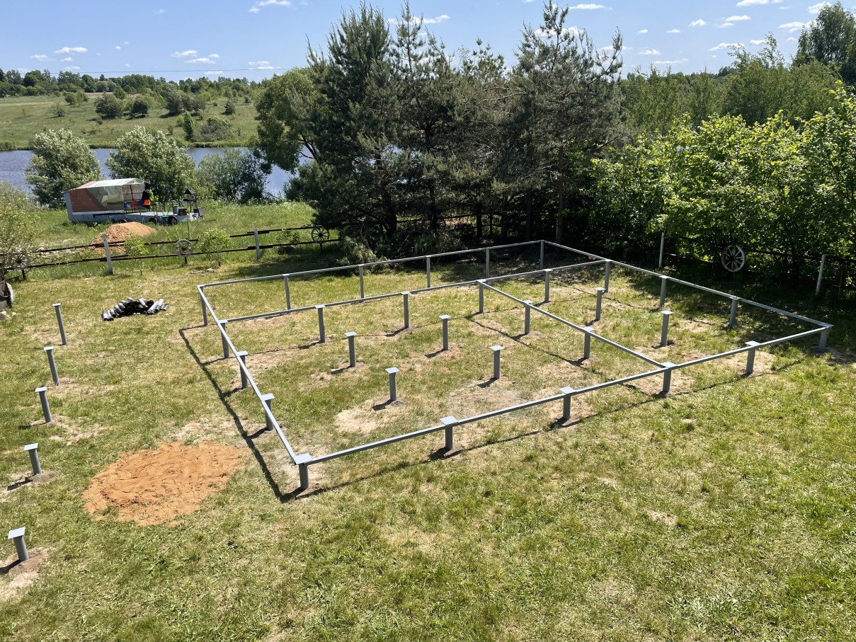 Фундамент для А-фрейм дома в Сморгони: 24 сваи диаметром 89 мм для устойчивости треугольной конструкции