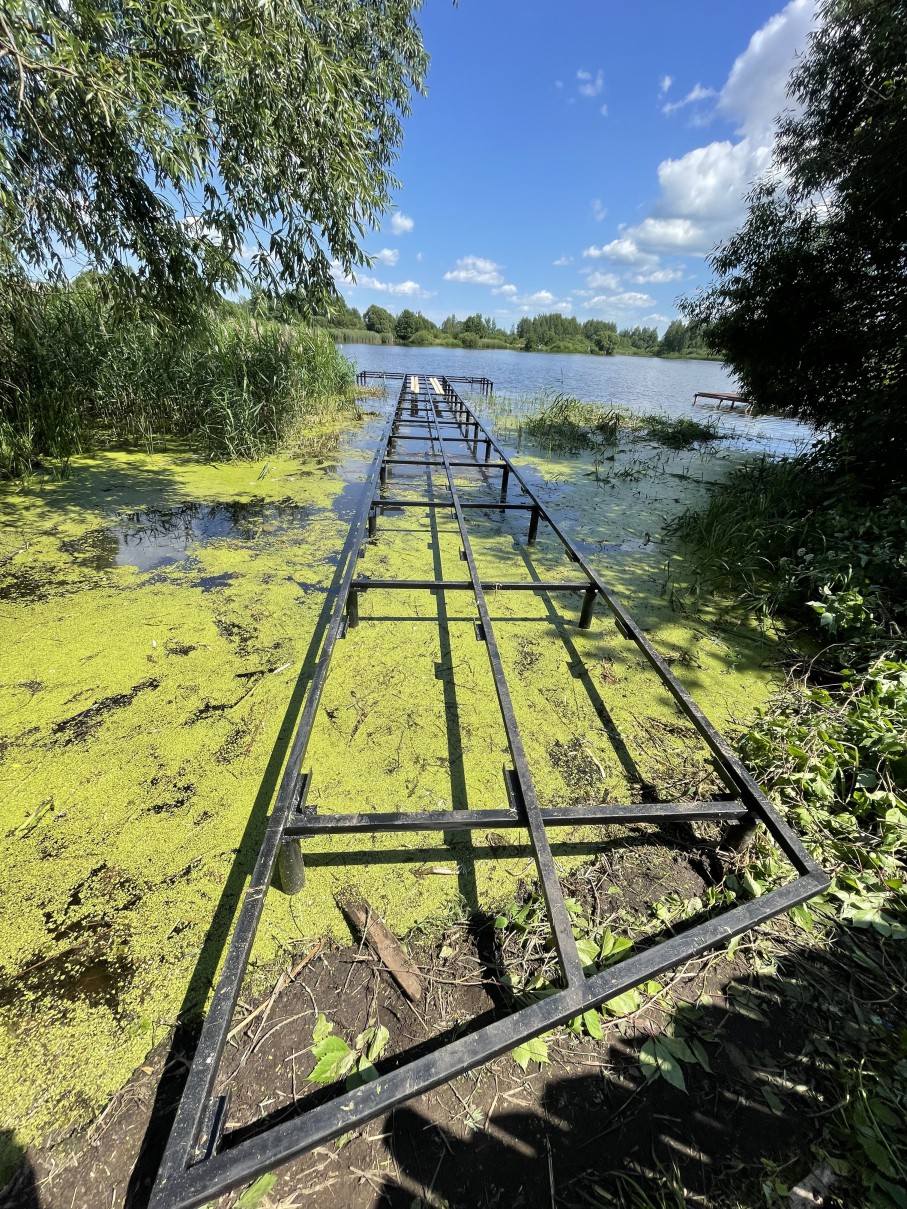 Монтаж 35 винтовых свай диаметром 89 мм. Длина свай индивидуально подобрана от 2,5 до 4 метров с учётом глубины водоёма и рельефа дна.