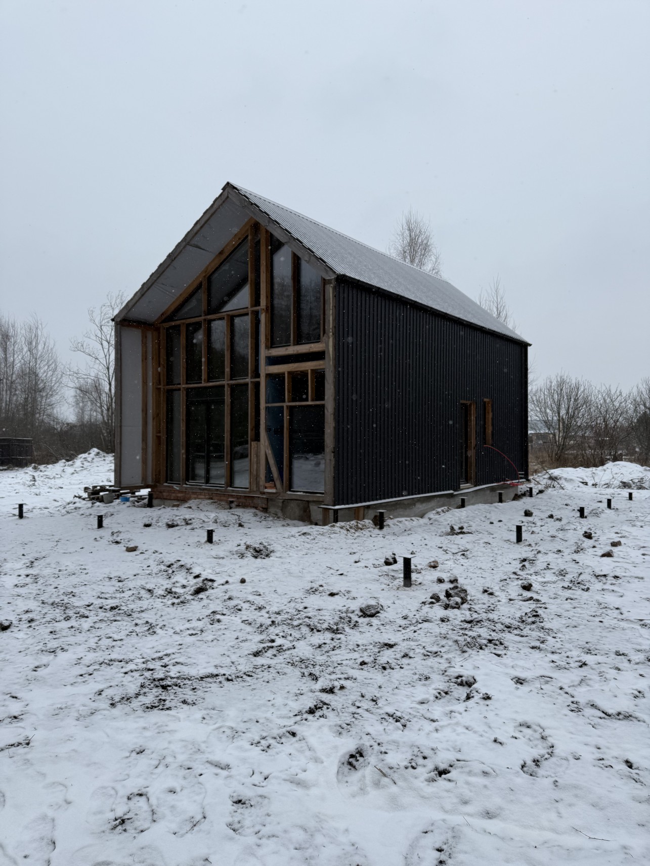 Фундамент для А-фрейм дома в Сморгони: 24 сваи диаметром 89 мм для устойчивости треугольной конструкции
